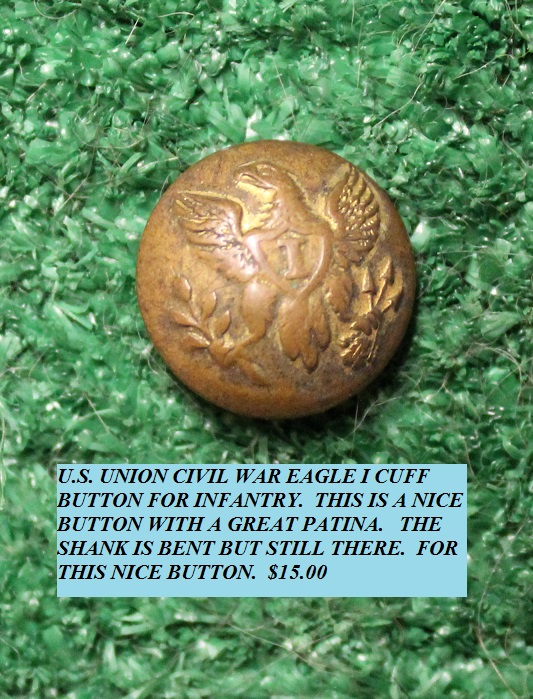 Here are 3 early buttons. There are 2 one piece eagle I's and 1 one piece New York button. The eagle I on the left is 3/4" it is dug and backmarked SUPERIOR QUALITY the 2nd eagle I is approx. 7/8" It is nondug and backmarked A.W. SPIES RICH. Both have straight shanks but show wear. The New York is approx 7/8" and backmarked RICH STANDARD It looks to have been dug and has a small ding under the eagle and a flattened shank. The 2 eagle I's are $25 each while the New York Button is $45.00 ref-button 17