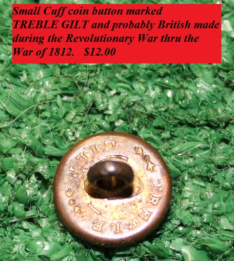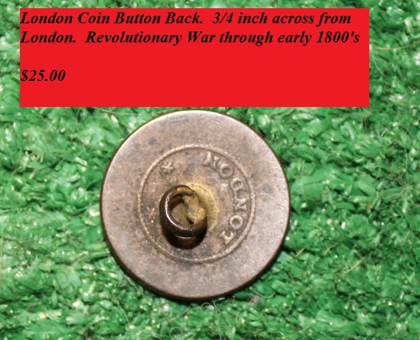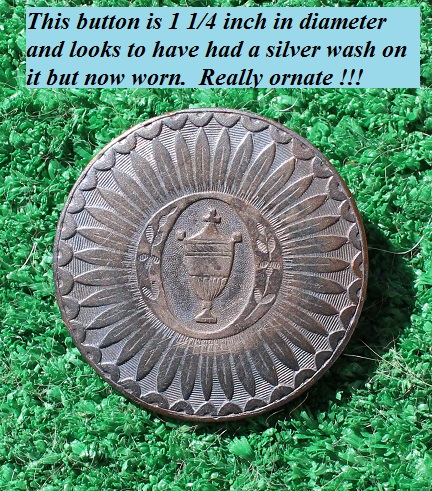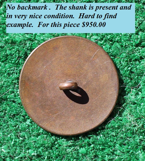 Here's an early New York button from around 1830. This is listed in Tice's button book as NY100A9 and is marked Rich Standard on the back. This is a coin type button with a very nice patina. The shank is present but smashed flat. Still nice! ref-button 7 $45.00