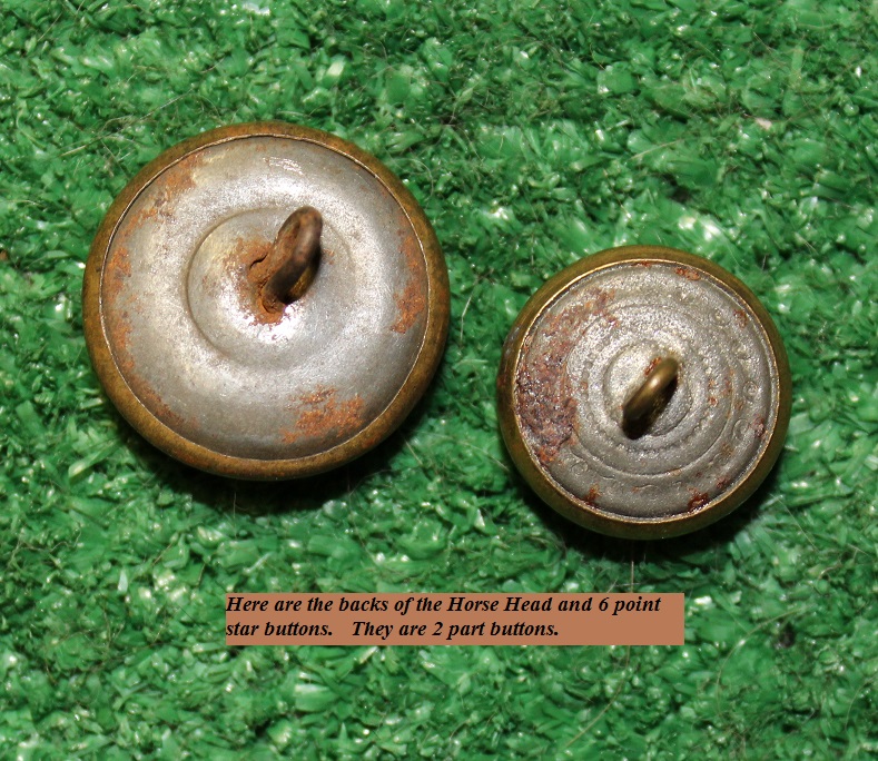 This next button is a fine high convex California State Seal button with the backmark of Waterbury Button Co. on it. This is a great post war button and hundreds less than the Civil War dated one. ref-button 65 $20.00
