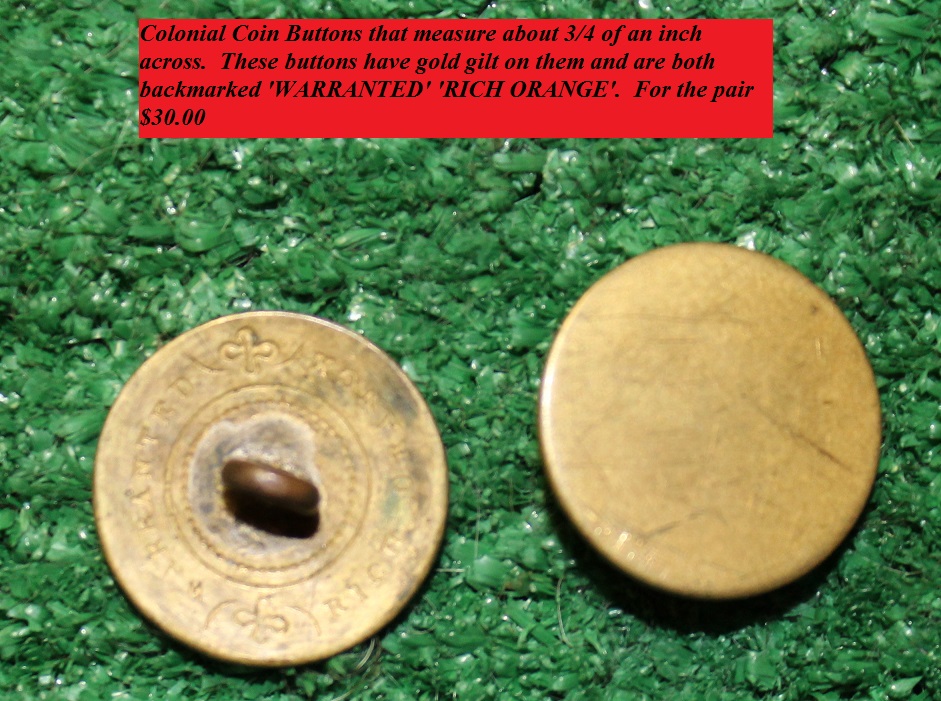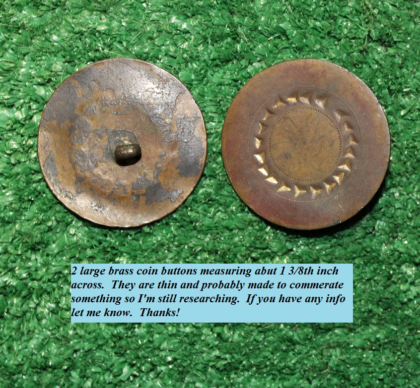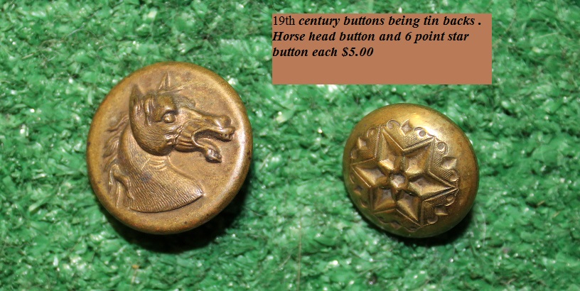 We picked up some buttons here in Central Indiana. Here we have a lot of State Seal Buttons that are post Civil War but more affordable then the ones made during the Civil War and they look just the same. Some of what we have is NORTH CAROLINA, OREGON, WEST VIRGINIA, LOUISIANA, SOUTH CAROLINA, MISSISSIPPI, MONTANA, COLORADO, ARIZONA, ETC. all with different backmarks. Let us know what you are looking for as we may have it. ref-button 14 $20 each.
