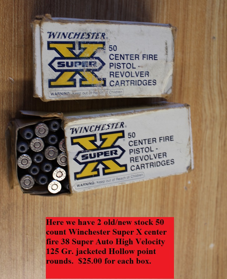 Here we have several boxes of old/new stock .38 Super Auto Ammuntion for the very popular .38 Super Auto 1911 pistol! These pistols of various manufacturers are usually very well made and the price of each can be expensive. Take a look at the pics and let me know if you would like to buy some of these boxes. All have been discounted.