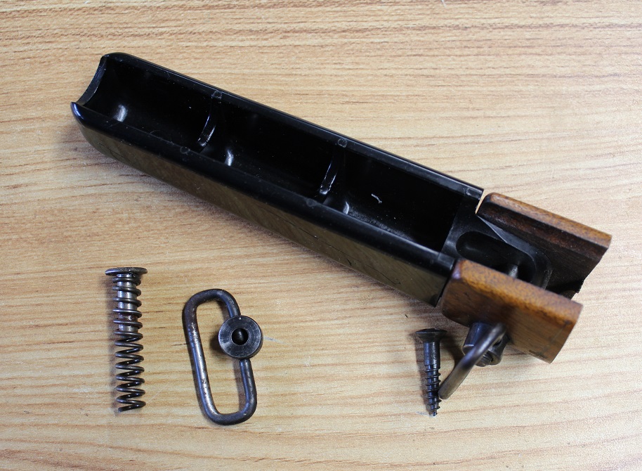 Original Tenite hinged pull down hand grip style forend with sling swivels and butt plate for the Mossberg Model 432KA bolt action .22 rifle. These parts are in excellent condition with sling swivels as well as forend spring and large head pin. Take a look at the pics. If you have a broken or missing one you will probably never find another one.