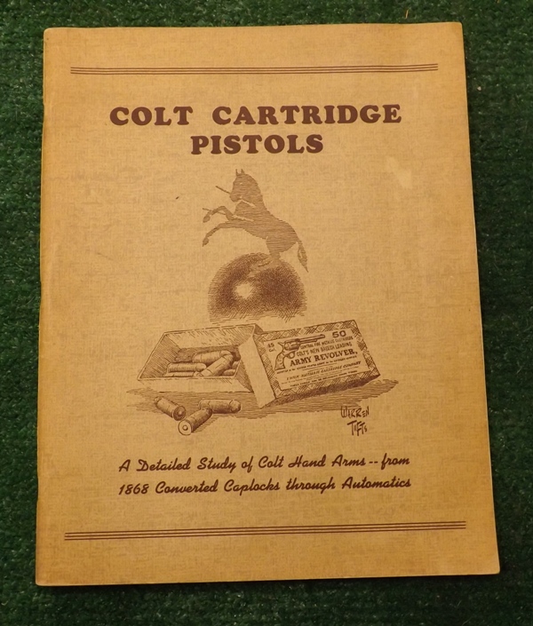 Here is a real good copy of COLT CARTRIDGE PISTOLS - A DETAILED STUDY OF COLT HAND ARMS--FROM 1868 CONVERTED CAPLOCKS THROUGH AUTOMATICS. Santa Ana CA Published by author 1952 First Edition Softcover Very Good+ Printed by the Foundation Press. Quarto sized staple-bound softcover, about 11 inches tall, in beige wraps. 126 pages plus 2 pages of ads. Illustrated by drawings and photographs. A company history displaying dozens of variations and conversions with detailed specifications. This is a nice one and shows little wear.$40.00