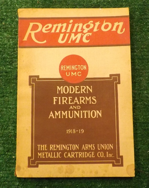 Here's an original catalog entitled REMINGTON UMC - MODERN FIREARMS AND AMMUNITION 1918-19. THE REMINGTON ARMS UNION METALLIC CARTRIDGE CO., Inc. This fine catalog has some small amount of staining to the front lower cover and the inside pages have yellowed but they are still in very nice condition!!! 208 pages of excellent text and illustrations including firearms, ammo, ect. This is a very nice reference catalog! $95.00