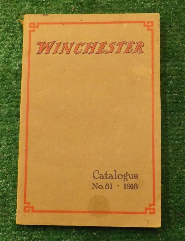 This is an original WINCHESTER CATALOGUE NO. 81 -1918 catalogue! There are a couple of minor spots on the brown covers and gorgeous text and illustrations on this catalogues 213 pages. The pages are bright and the binding is tight. This is a nice piece!!! This catalog is for firearms, parts, ammo and etc. The catalog has some nice exploded views which makes it invaluable as a reference piece!!! $95.00