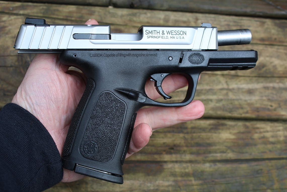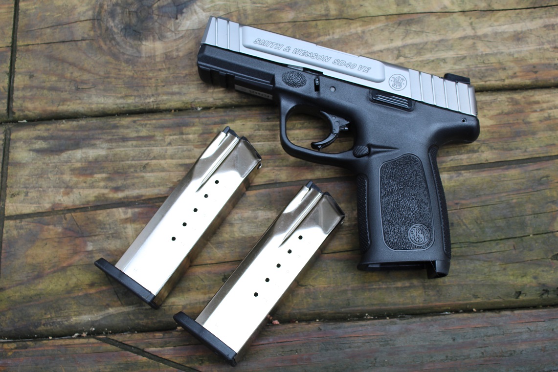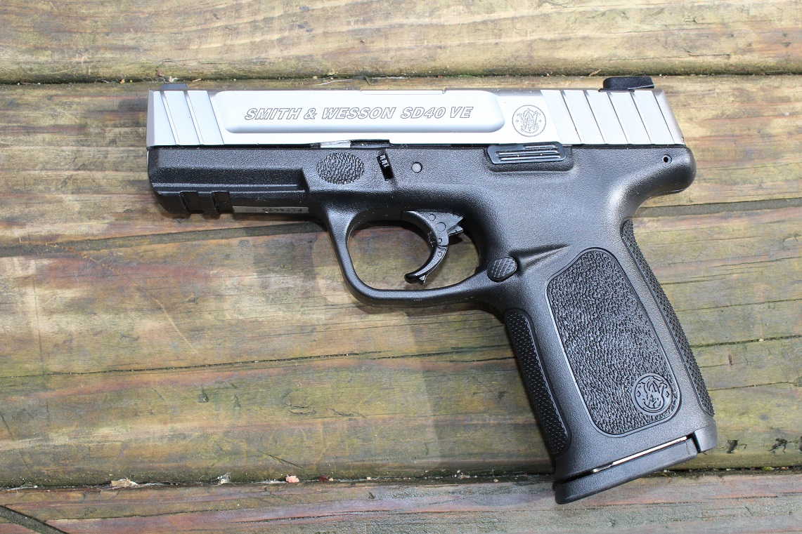 Here we have a barely used Smith & Wesson SD40 VE .40 Caliber semi auto pistol in box with papers. The Smith & Wesson SD40 VE 40 S&W Full-Sized 14-Round Pistol features a lightweight polymer frame and a stainless-steel slide and barrel. The semiautomatic double-action pistol has a Picatinny rail and comes with two 14-round magazines. White-dot dovetail front and rear sights.