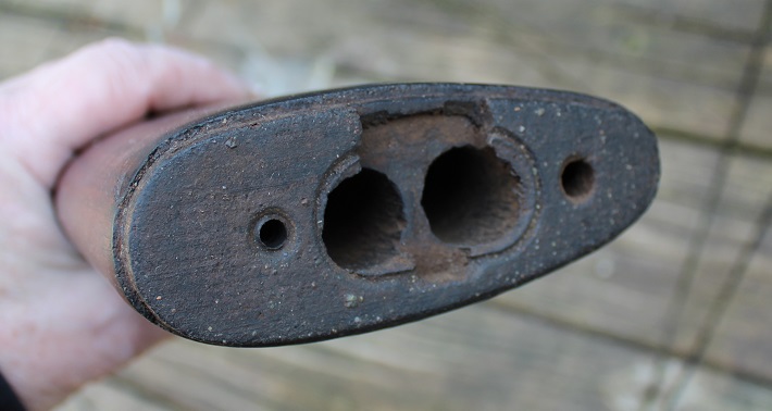 This second one is a single barrel Mass. Arms Co. 12 ga shotgun made in Chicopee Falls, Mass. The bore is rusty near the chamber and should clean from fair to poor. I wouldn’t shoot this one but it could be shot. We never warrant these old guns to shoot! The metal is a nice dark patina and would look great over the fireplace. The action does work fine. The bead is missing at the end of the barrel. The stock has a 1 ½ inch sliver missing at the tang on the obverse side top and there is a crack behind the stock making the buttstock a little out of line. The forearm is fine just dings and dented as usual. Back in the day an old single barrel shotgun stood behind the door in many of a household! For this old war horse $60.00
