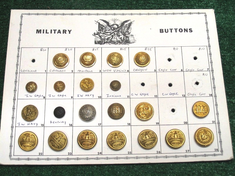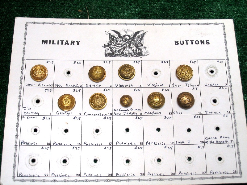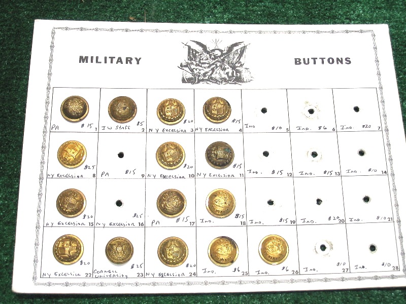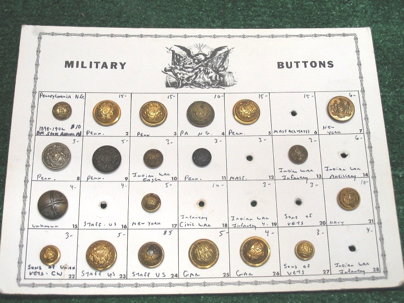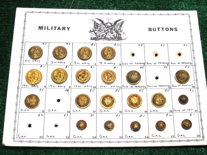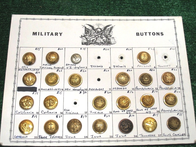 SOLD some of the GAR and SOV buttons! This next display card has buttons from Pennsylvania, New York, GAR, Sons of Vets, IW Eagle buttons Navy and Staff buttons. ref-button 73