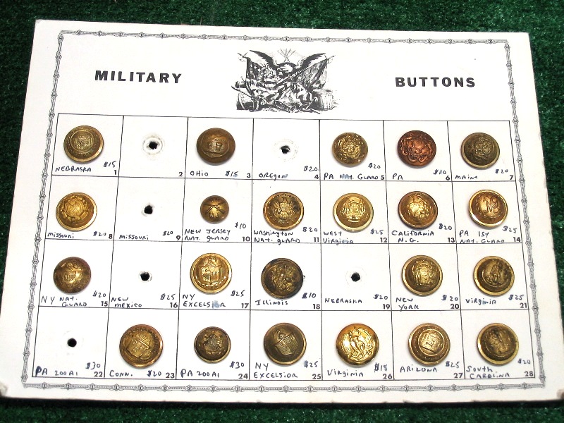 This next display card has buttons on it from Nebraska, Missouri, Ohio, New Jersey NG, Washington NG, West Virginia, California, PA NG, Maine, NY NG, NY Excelsior, Illinois, New York State Seal, Virginia, Connecticut, Pennsylvania, Virginia, Arizona and South Carolina. ref-button 74