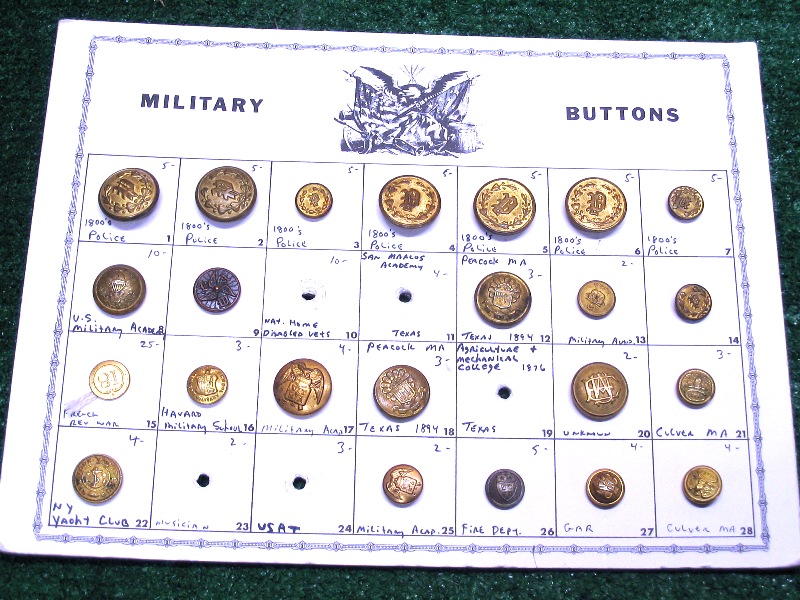 This card has some 1800's Police buttons on it, US Military Academy, Peacock Military Academy from Texas, Culver Military Academy, NY Yacht Club,GAR buttons, other military academy buttons and some unknowns. Heck, there is even one from the Havard Military School. ref-button 80